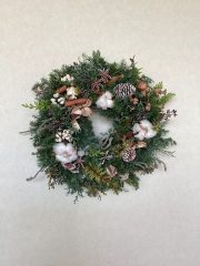 生の針葉樹とドライの実をたっぷり使って、クリスマスリースを作ります。